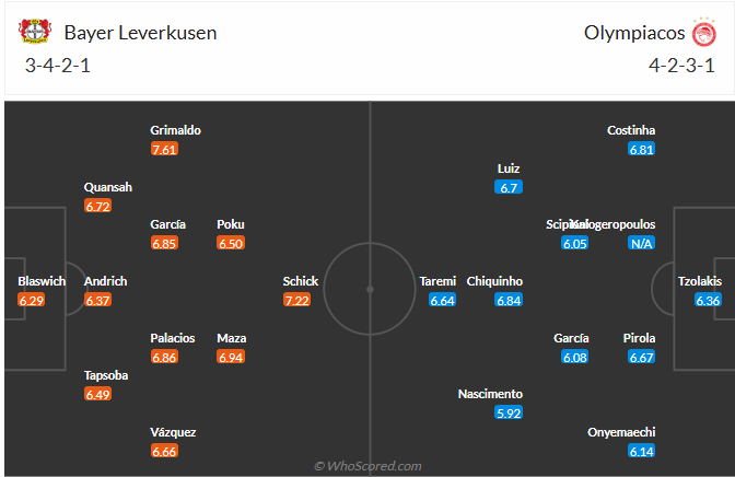Leverkusen đang chơi không ổn định mùa giải này. Họ chỉ có thứ 6 tại Bundesliga và phải cố gắng nhiều để được dự Champions League mùa tới. Tại đấu trường cup châu Âu thì đội bóng của HLV Kasper Hjulmand chơi không thật sự ấn tượng nhưng việc vào vòng play off cũng không phải kết quả quá tệ với họ. Đội bóng nước Đức đã giành được lợi thế cực lớn khi thắng Olympiakos 2-0 trong trận lượt đi ngay trên sân đối phương, tỉ số này giúp các cầu thủ Leverkusen có nhiều lựa chọn trong cách tiếp cận trận đấu. Nhiều khả năng họ sẽ tiếp tục giành chiến thắng ở trận lượt về.